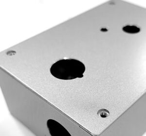 既製品の盤用アルミBOXにボタンやファンの取付穴の追加工もスピーディーに対応します。